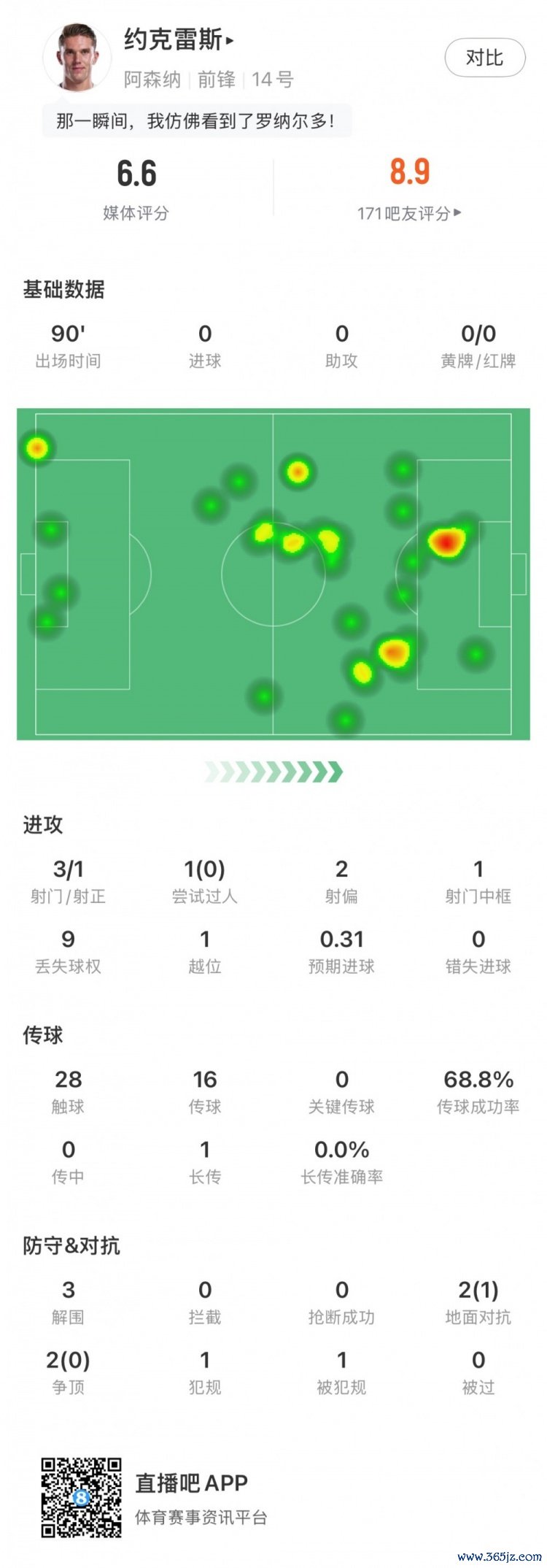 本场比赛约克雷斯为枪手首发踢满全场,出任球队的迫切桥头堡,同期还积极参与防患,赛后他赢得了6.6分的全场评分。