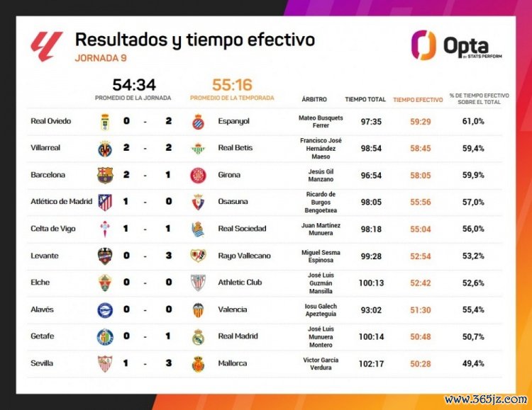 10月21日讯 OPTA统计了西甲第九轮各场比赛的有用技术,莫得任何一场比赛的有用技术跳动60分钟。