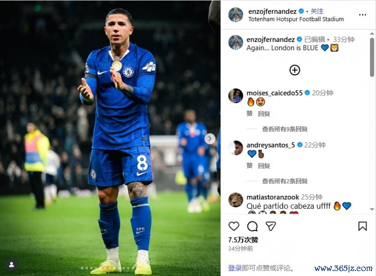 恩佐上传了我方在比赛中的相片,并配文写说念:“再一次……伦敦是蓝色的💙🦁”。