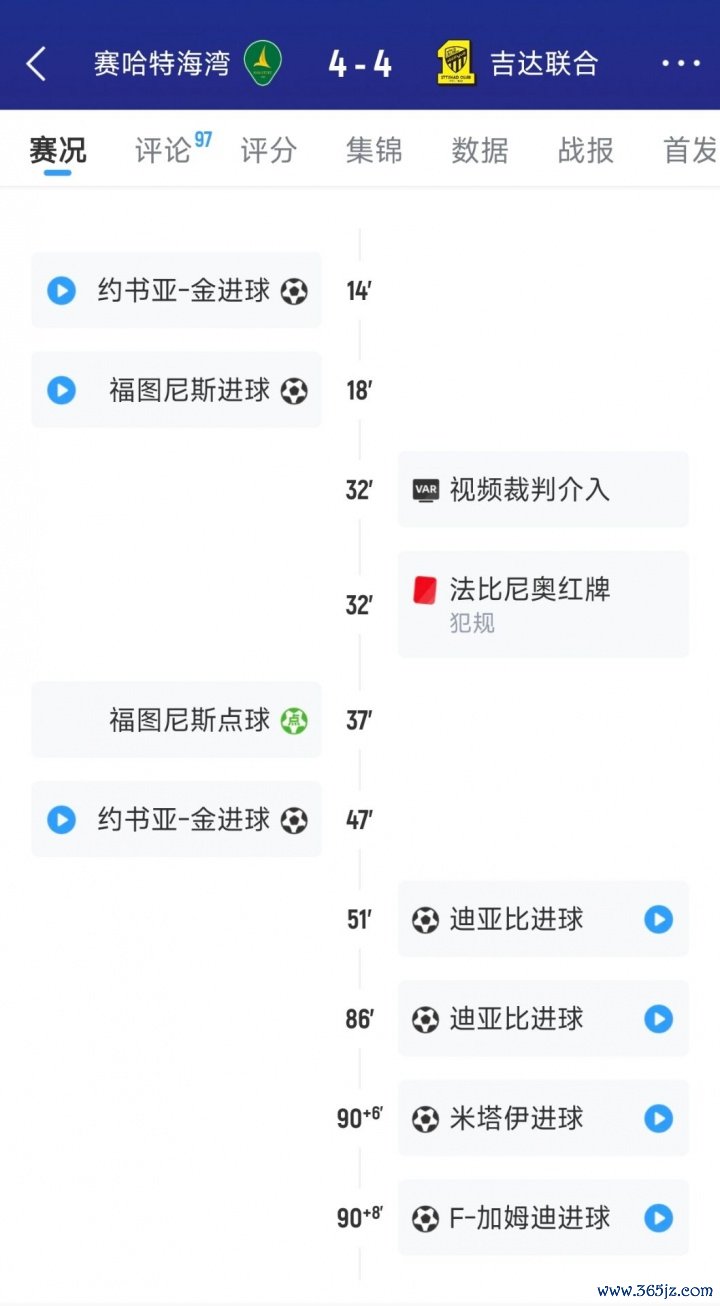 前英超名将迪亚比第51分钟为吉达鸠合吹起反击的军号,10东说念主应战的吉达鸠合在第86分钟、90+6分钟,90+8分钟连进3球,将比分打平成4-4,完成了惊天的绝平。