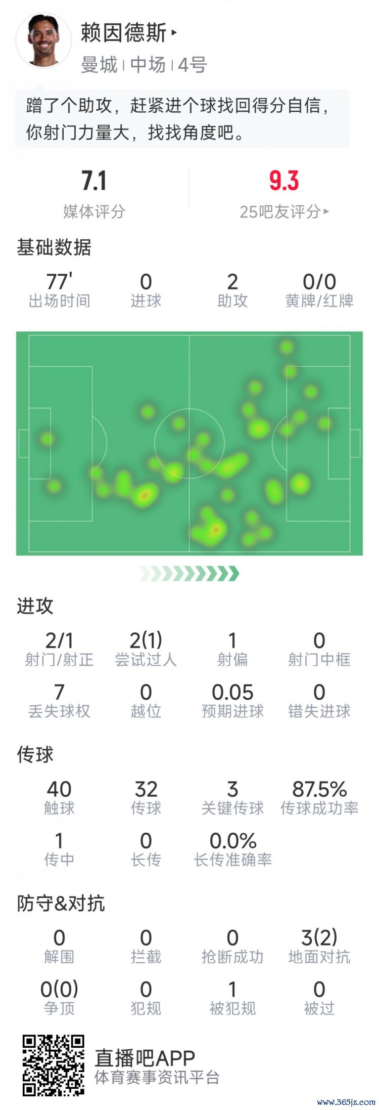 赖因德斯本场数据:助攻双响,2射1正,3次要津传球