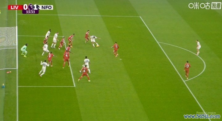 11月22日讯 利物浦vs丛林第34分钟,丛林依靠角球迫切由穆里略获取进球。