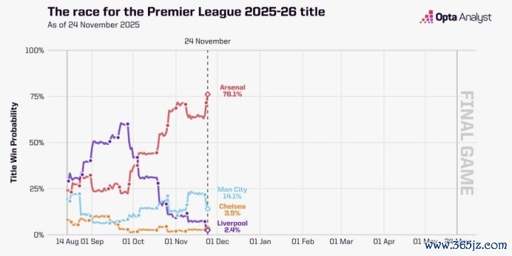 Opta英超夺冠概率:枪手76.14%领跑,曼城14.11%第二,赤军跌第四