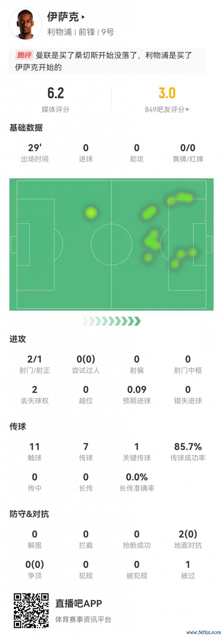 11月27日讯 利物浦在本轮欧冠1-4惨败埃因霍温,伊萨克本场数据如下: