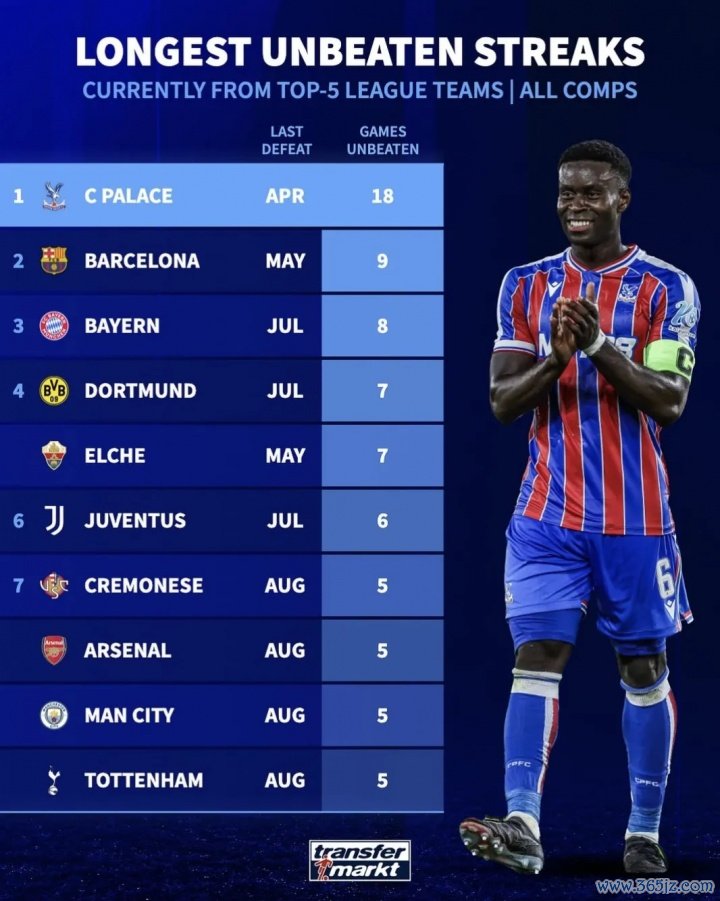 10月1日讯 证明德转统计,水晶宫是五大联赛现时各项赛事不败场次最多的球队,他们自4月以来也曾跨赛季18场不败。