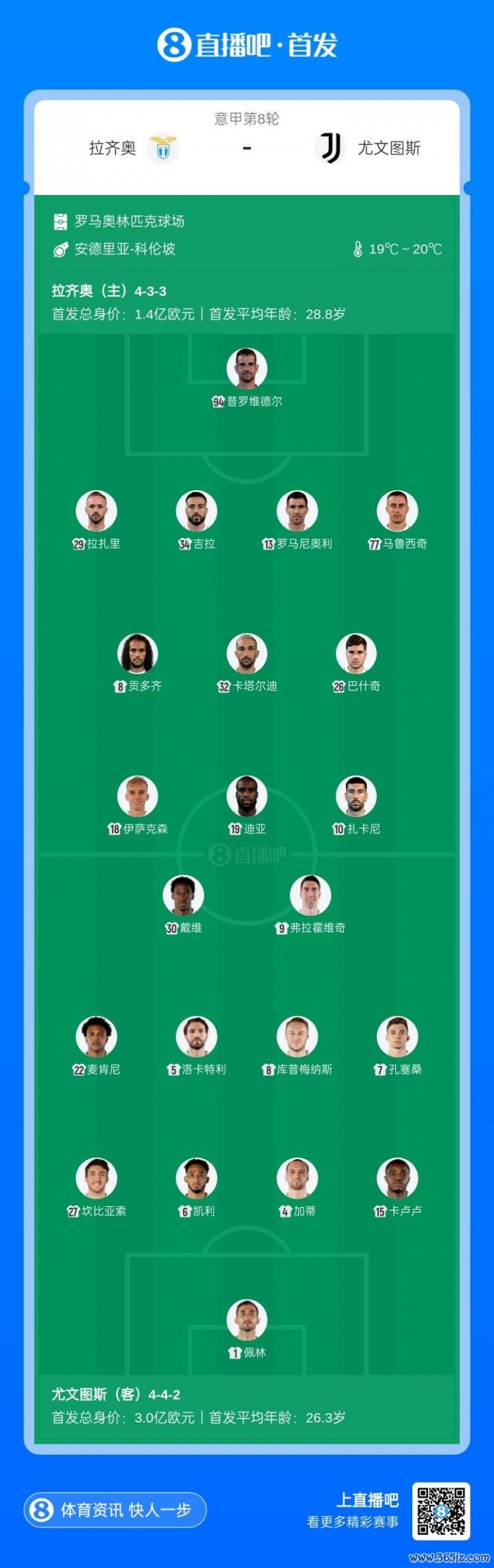 10月27日讯 意甲第8轮,拉皆奥对阵尤文图斯,赛前首发公布。