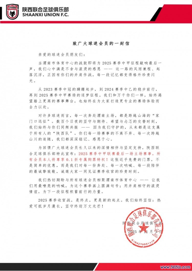 11月3日讯 中甲联赛终末一轮,陕西鸠合将在主场对阵广西平果。陕西鸠合俱乐部官方发布致高大球迷会员的一封信,本场比赛,所有这个词会员将享0.1折专属购票特权。