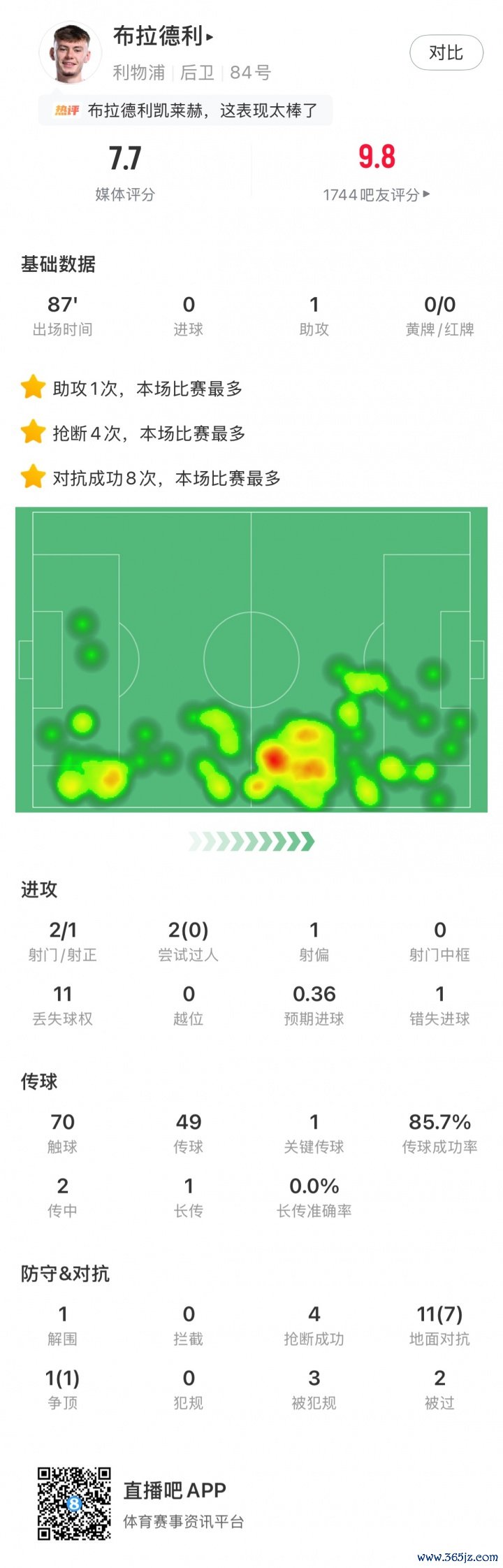 而在近1年之前,旧年的欧冠联赛阶段第5轮,利物浦2-0皇马。在这场比赛中布拉德利也发挥出色,其时布拉德利送出1次助攻,4次抢断,挣扎得胜8次,评分7.7分。
