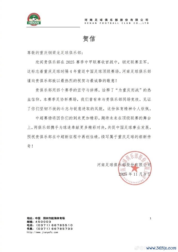 欣闻贵俱乐部在2025赛季中甲联赛收官战中,锁定联赛亚军。这记号瞩目庆足球时隔4年重返中国足球顶级赛场,河南足球俱乐部谨向贵俱乐部致以最蛮横的道贺与最古道的敬意!