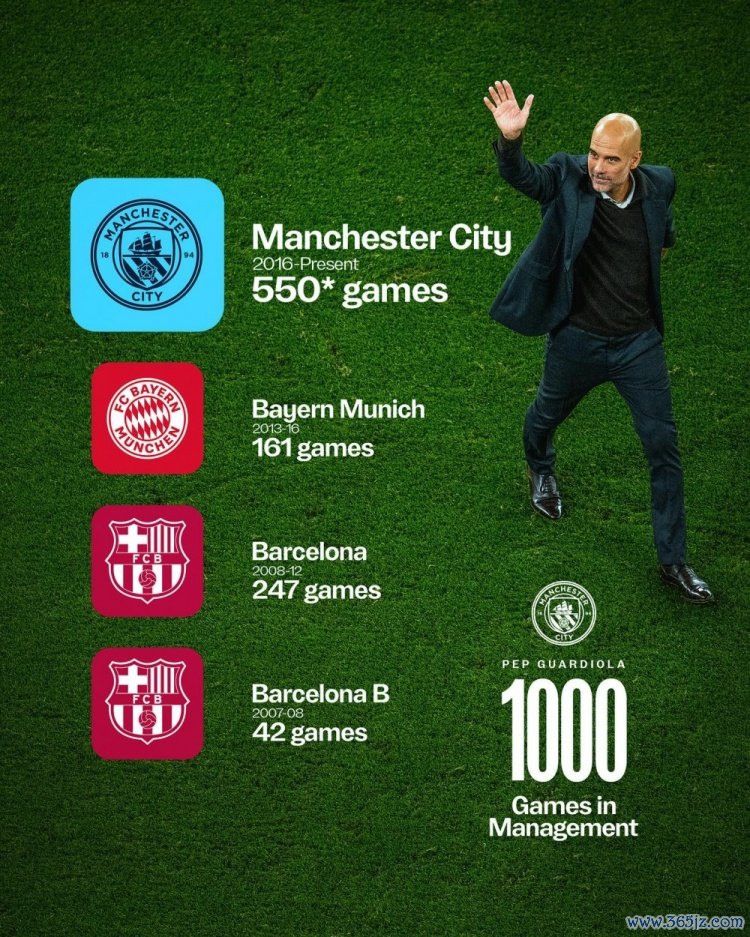 曼城官方晒瓜帅千场散布:曼城550场、拜仁161场、巴萨247场