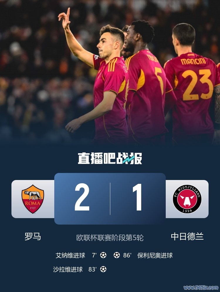 切利克助攻艾纳维破门,科内伤退,沙拉维进球扩大比分优势。全场比赛圆寂,罗马2-1中日德兰。
