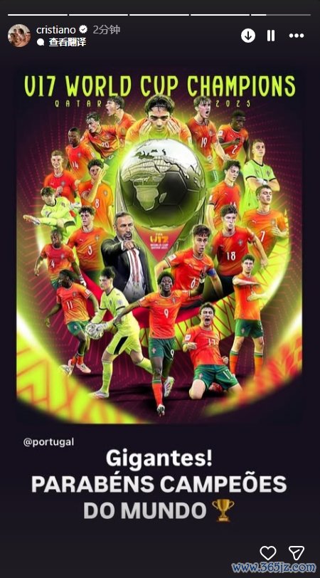 葡萄牙U17宇宙杯夺冠,葡萄牙球星C罗在社媒为U17队奉上了道喜,C罗转发了葡萄牙的夺冠海报,并配文:“巨东说念主!恭喜你们,宇宙冠军🏆”