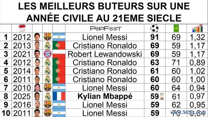 姆巴佩59球进入21世编年度弓手榜前10!91梅第1 C罗、莱万69球第2