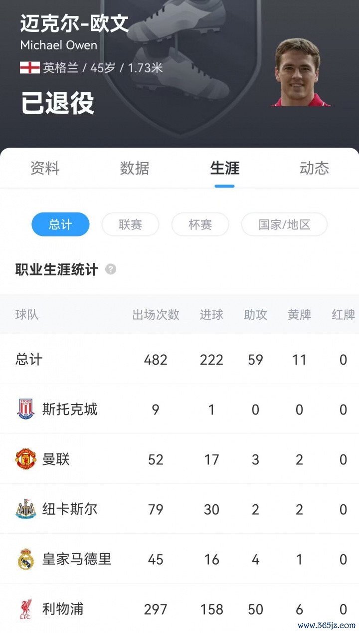 欧文出谈于利物浦,曾连合得回97/98、98/99赛季英超金靴奖,2001年得回金球奖,但早早到来的伤病使欧文的作事生存未能一直保抓气象。他的作事生存盘曲于利物浦、皇马、纽卡、曼联等多支球队,最终在斯托克城退役。