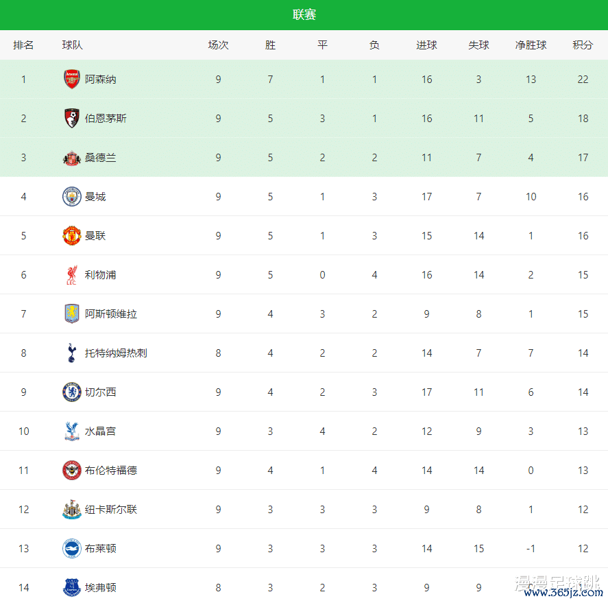 英超第九轮战罢,领头羊阿森纳延续狂飙,1-0险胜水晶宫强势领跑积分榜,埃泽打入全场独一进球;曼城则是在客场0-1爆冷倒在维拉眼下,连胜就此闭幕;大黑马伯恩茅斯主场2-0完胜诺丁汉丛林,抢占积分榜次席,另一头黑马桑德兰排在第三高位,现如今的英超争冠与争四,的确是乱成一锅粥啦!