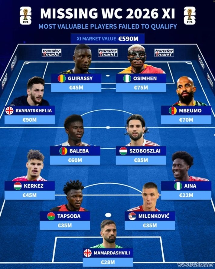 11月19日讯 本日德转社媒晒图,列出无缘2026寰宇杯球员中身价最高的首发声势,奥斯梅恩、姆伯莫、K77、索博斯洛伊等多名球星在列。