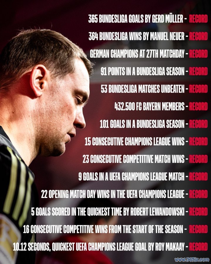 拜仁社媒晒记录:诺伊尔德甲取胜364场,球队赛季开局16连胜