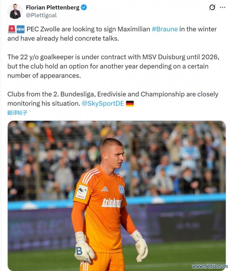 记者:兹沃勒有利杜伊斯堡门将布劳内,德乙、英冠也有球队抠门他