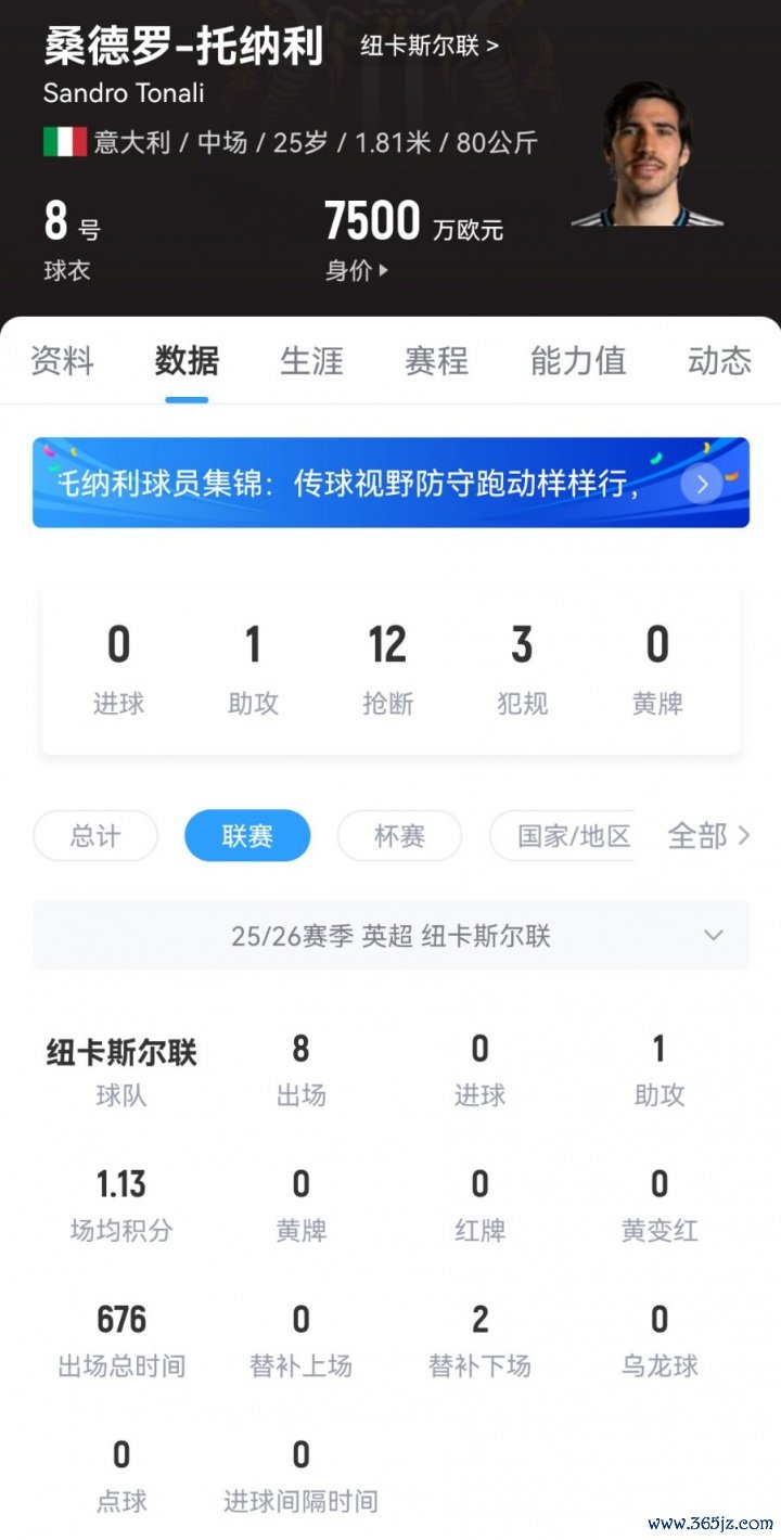 25岁的托纳利本赛季于今也曾为纽卡在联赛出战8场比赛,孝敬1个助攻,他当今的德回身价为7500万欧元。