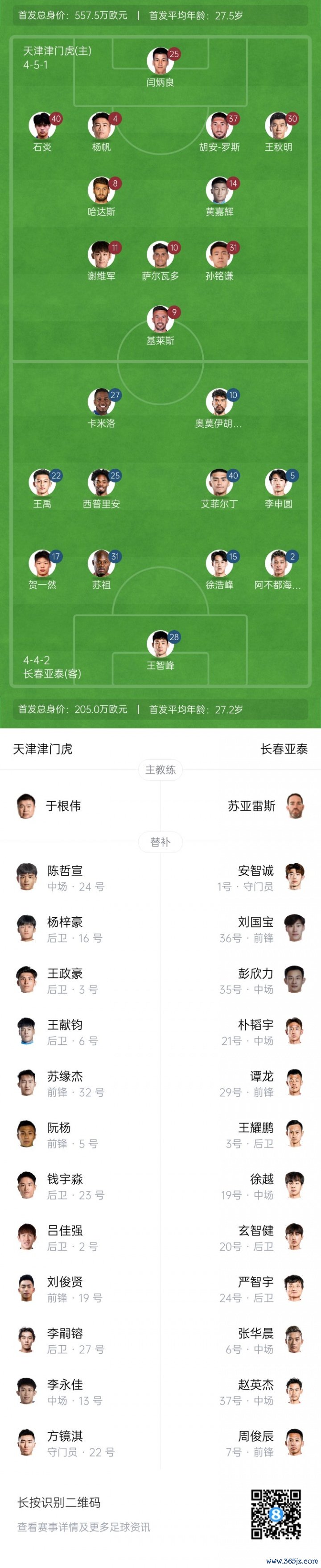 10月25日讯 北京工夫15:30,中超第28轮,天津津门虎vs长春亚泰,赛前官方公布首发气势。