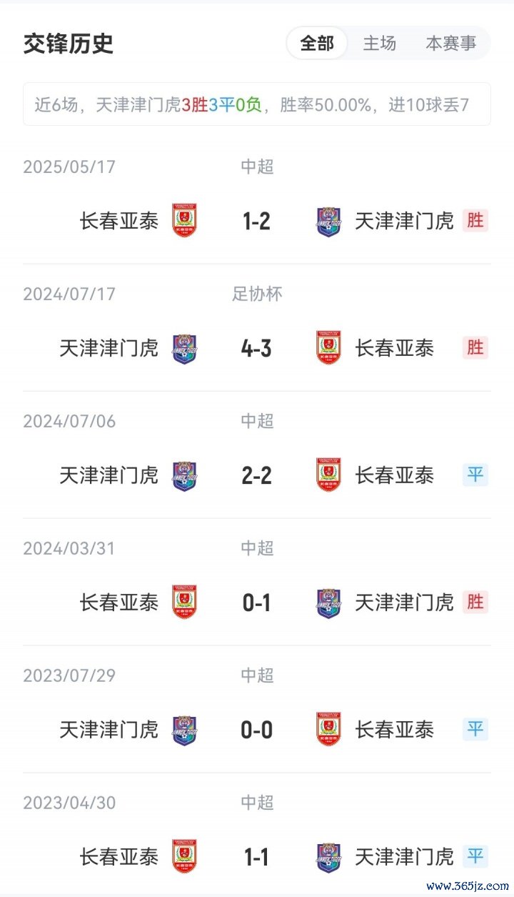 适度赛前,天津津门虎在中超12胜7平8负,积43分排行积分榜第6;长春亚泰则是4胜6平17负,积18分排在倒数第一,离第14位的梅州客家有2分差距。