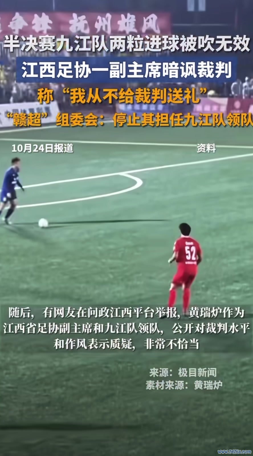 10月25日讯 据“极目新闻”报说念,因在赣超半决赛次回合九江队主场0-1不敌赣州队赛后发表针对裁判的不妥言论,江西省足协副主席、九江队领队黄瑞炉遭到处罚。