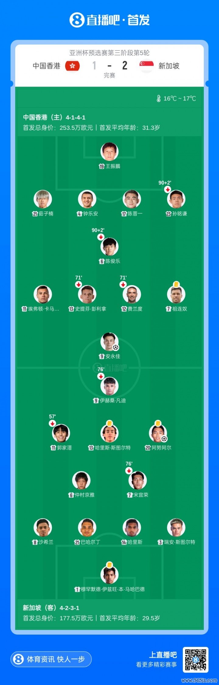 安永佳在第15分钟匡助中国香港首开记录,新加坡在第64分钟和第68分钟由阿尔努尔、伊尔汗·凡迪连入两球逆转。